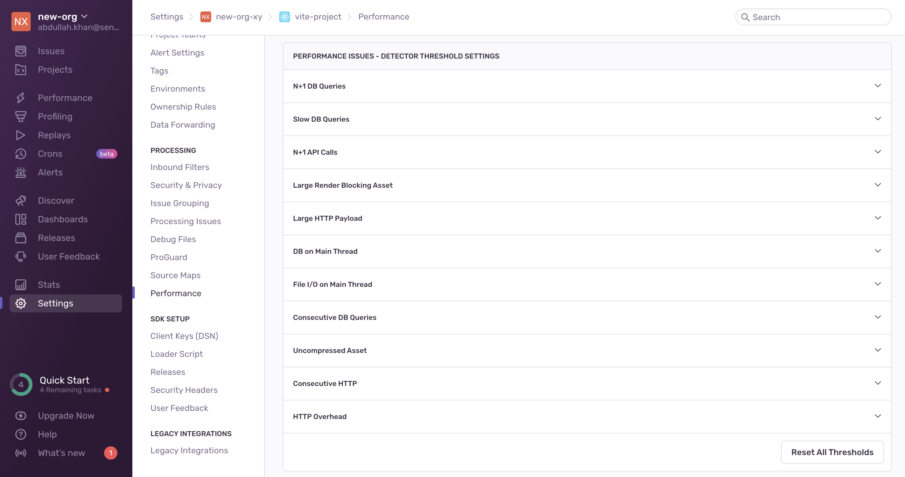 Once the detector has been tested and deployed, you can add the corresponding issue to the list of detector threshold settings in Project Settings > Performance: