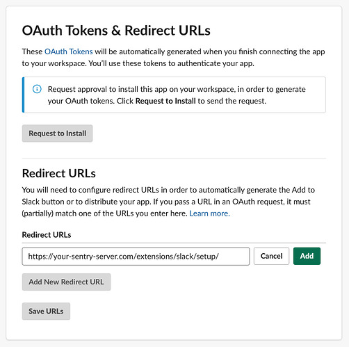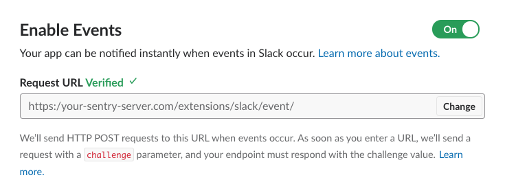 When you enter the 'Request URL', Slack tries to verify it. The request will fail if you didn’t configure the client keys/secret and restart Sentry to ensure those config changes were picked up. If it fails to validate, first make sure your Sentry instance is running and Slack can talk to it (Slack doesn’t have an IP range).